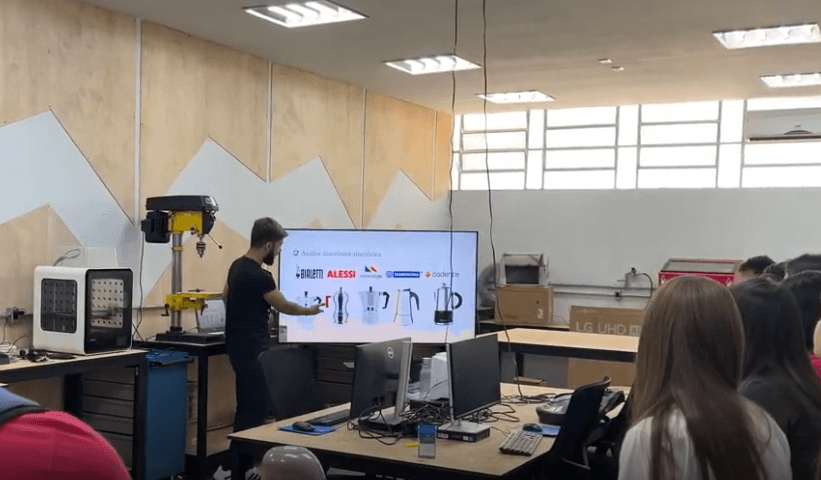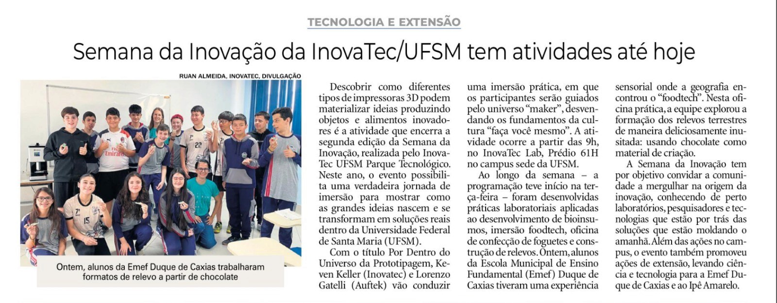 No dia 24/outubro de 2025, o Lorenzo Gatelli e eu encerramos a Semana da Inovação na UFSM com a atividade "Por dentro do Universo da Prototipagem". Nesse espaço, falamos sobre a importância da prototipagem em dois setores da tecnologia, no projeto de produto e na fabricação de alimentos. Enquanto eu falei sobre o desenho da cafeteira MOKA "Órbita", realizado em 2024 no curso de Desenho Industrial, Lorenzo explicou seu processo de montagem de uma impressora 3D para manufatura aditiva de alimentos. Ambos os projetos colocam a prototipagem como questão central para validar ideias mais rapidamente, ampliando a inovação nestes dois setores. A Semana da Inovação é um projeto do InovaTec UFSM Parque Tecnológico e contou com uma semana cheia de atividades em diversas áreas, demonstrando o potencial de inovação dos projetos desenvolvidos pela UFSM.