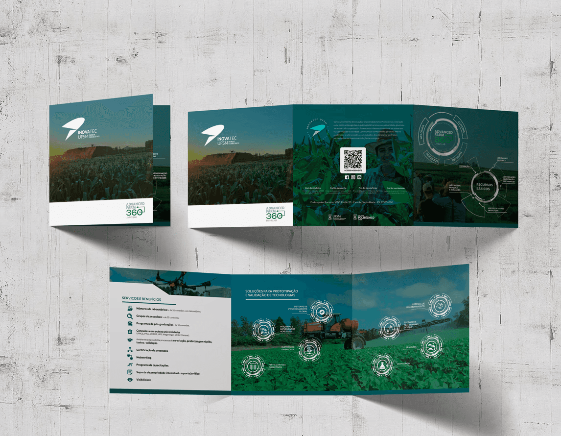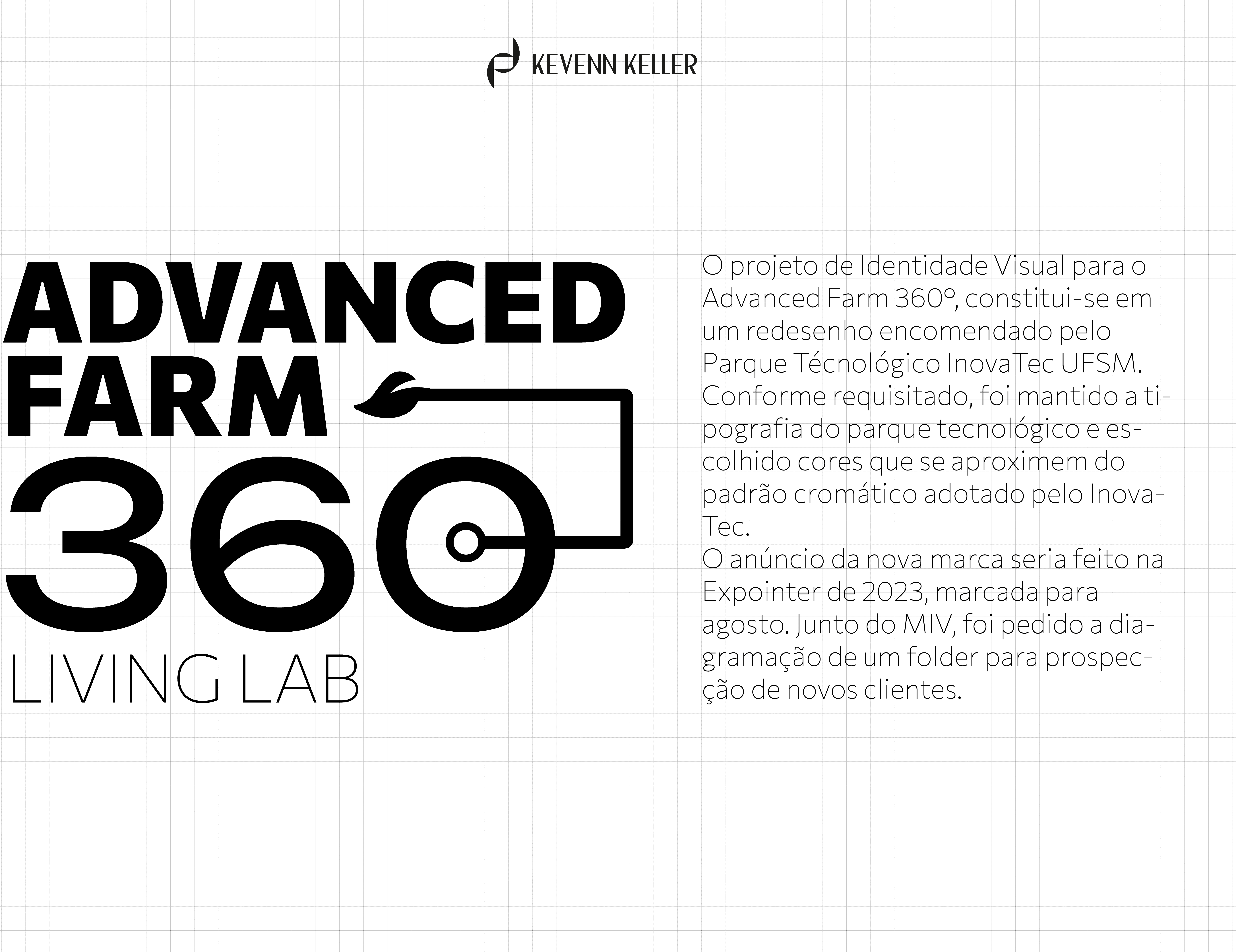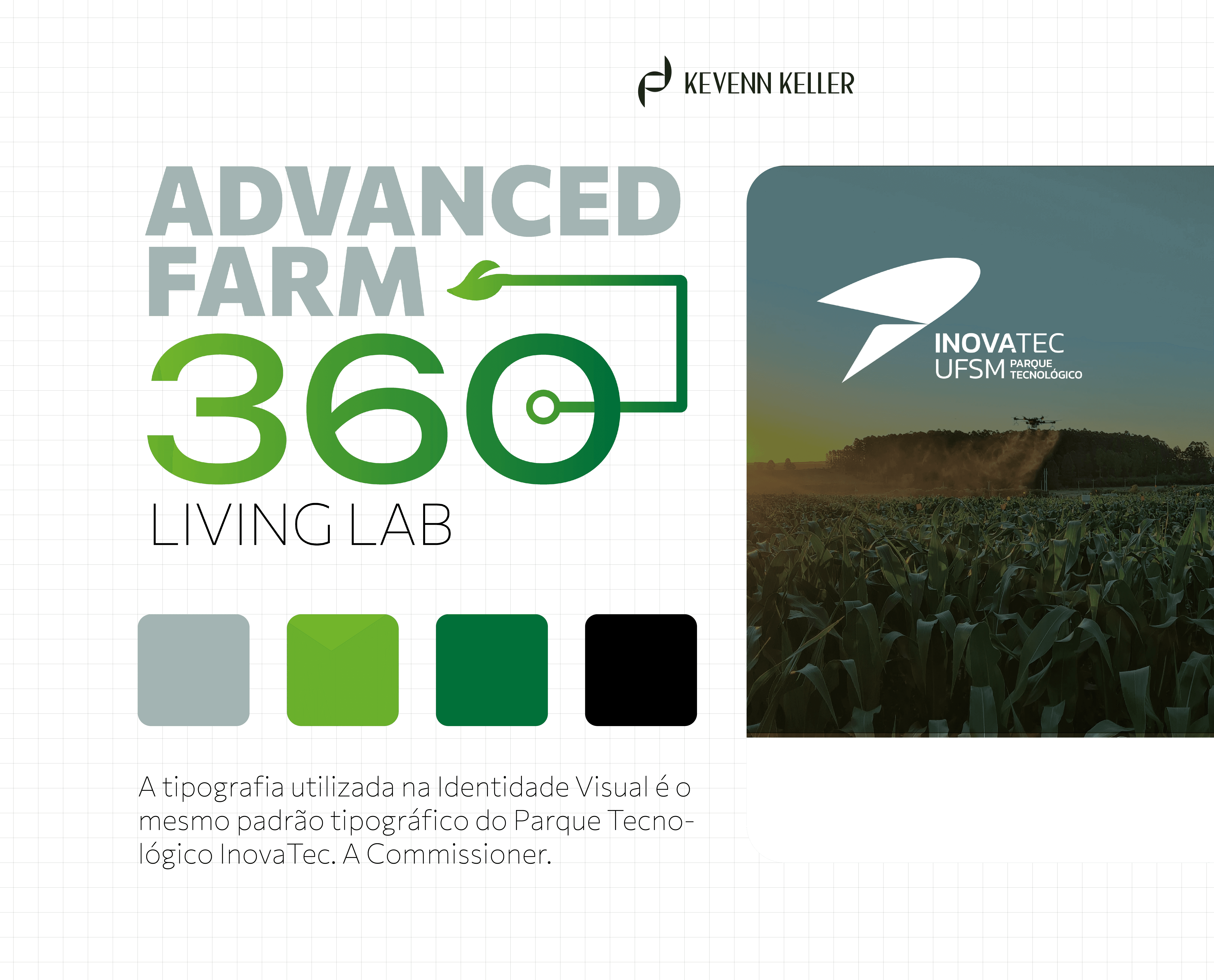 O Advanced Farm 360°, ligado ao Colégio Politécnico e InovaTec UFSM, é um espaço para prototipação agrícola. Em 2023, desenvolvi sua nova identidade visual, que substituirá a atual após a certificação como Living Lab, reforçando inovação e tecnologia no setor agro.
