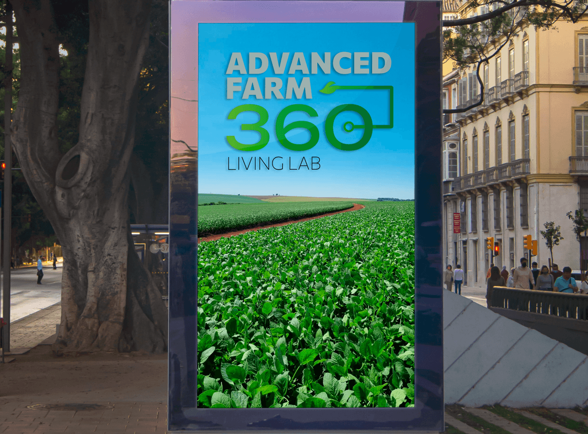 Um living lab é um espaço para testes e prototipagem no campo. Sua organização e configuração, garantem melhorias agrícolas e pecuárias, permitindo repensar as tradicionais fronteiras do agronegócio. A nova identidade visual do ambiente, o Advanced Farm 360°, deveria comunicar esse objetivo. O círculo indicando o grau do 360° foi inserido dentro do círculo desenhado pelo número 0, relembrando o ciclo da agrícultura.