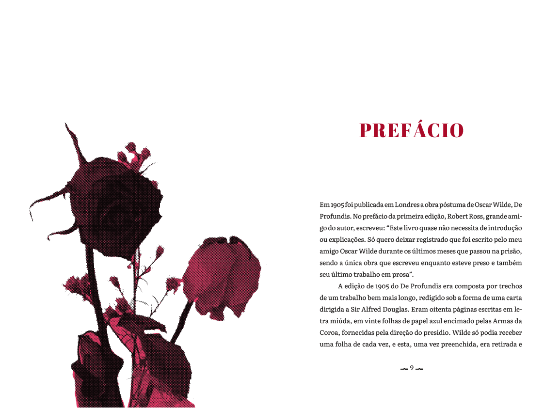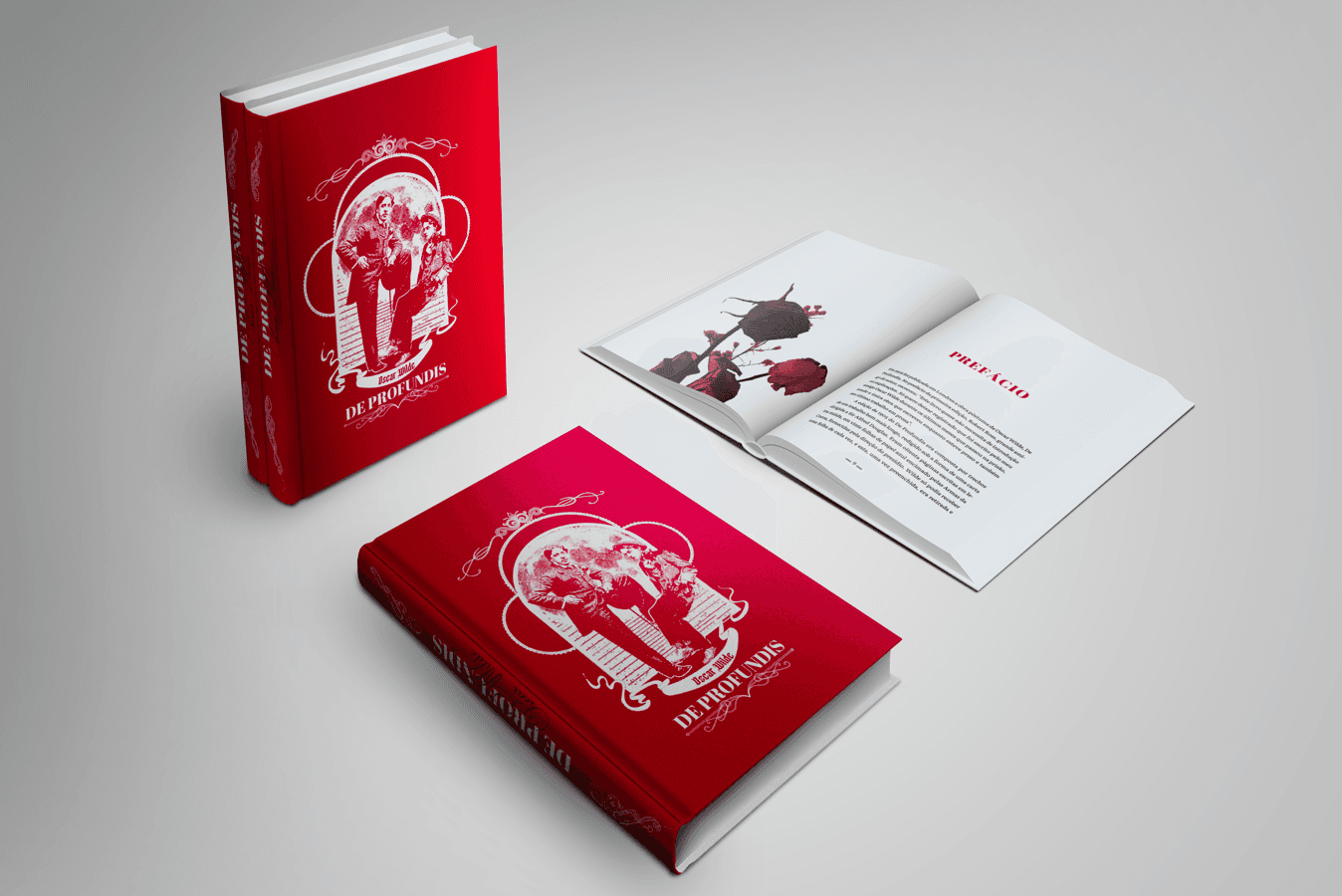 De Profundis, de Oscar Wilde, é uma carta escrita na prisão no início do século XX. O redesenho editorial envolveu pesquisa sobre a obra e seu contexto histórico, além da seleção de tipografia, mancha gráfica e papéis, criando um projeto que reflete a profundidade e a melancolia do texto.
