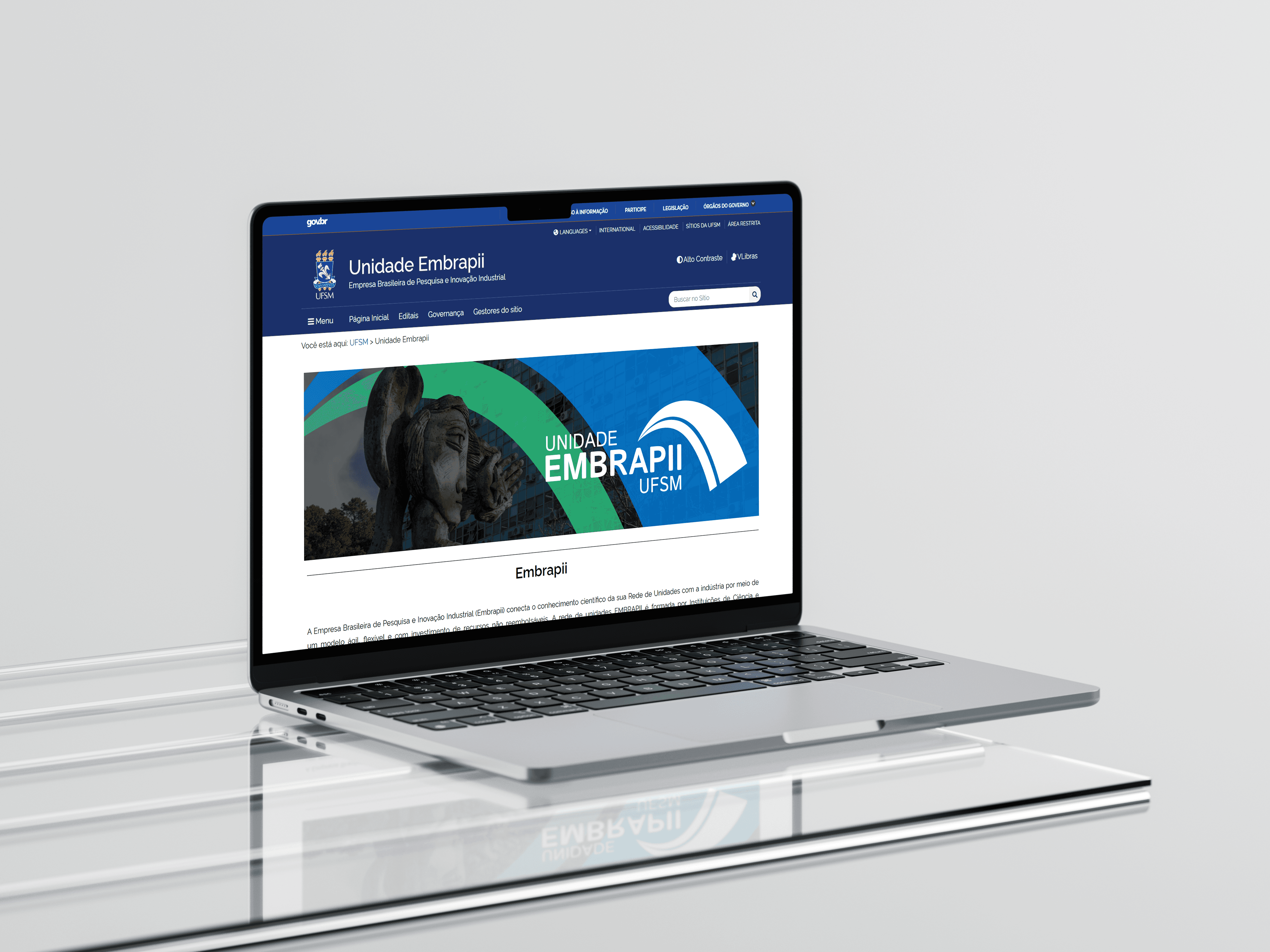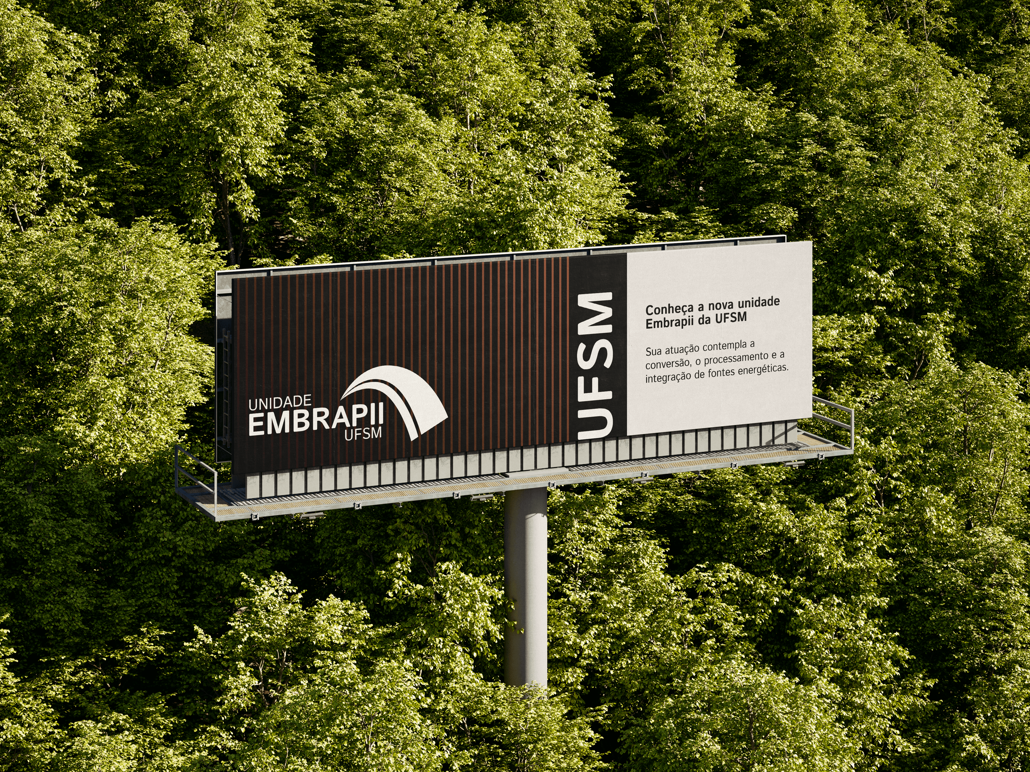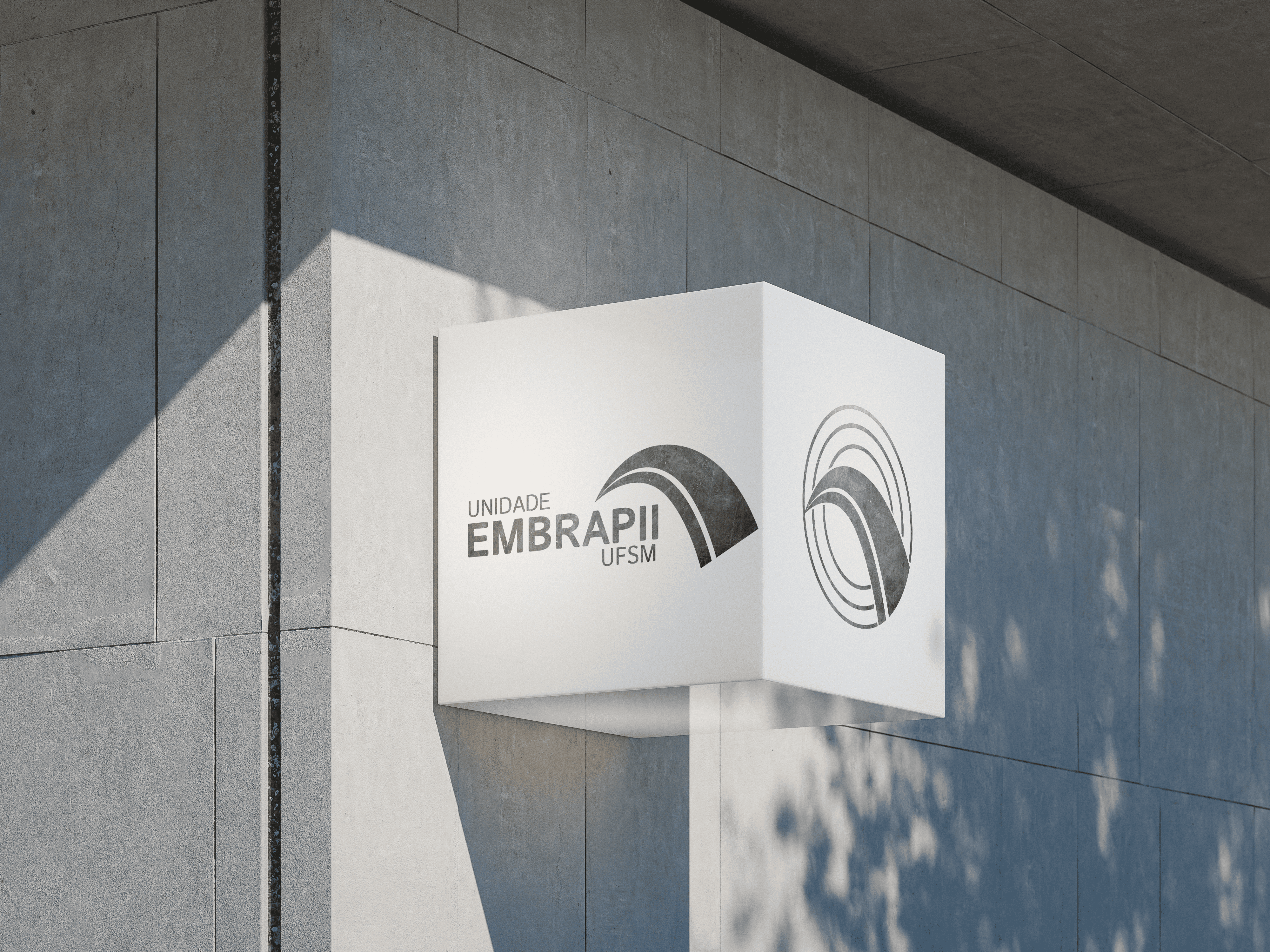 A unidade Embrapii da UFSM fica localizada no prédio 61H do Parque Tecnológico InovaTec UFSM. Como forma de aplicação da identidade visual em sinalização, foi desenvolvido um mockup (protótipo digital) para representar um meio de sinalização.
